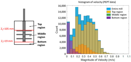 Histogram of the velocity magnitude for the attritor mill and for three sub-domains of the mill: top region, middle region and bottom region. PEPT test case using the bead loading of 2.4 kg, the impeller clearance of 19 mm and the impeller speed of 300 rpm.