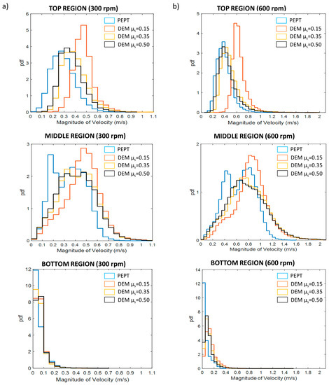 Probability density functions (pdf) of the velocity magnitude calculated for the top, middle and bottom regions. Comparison between PEPT data and DEM simulations as function of the static friction coefficient for the impeller speed of (a) 300 rpm and (b) 600 rpm.