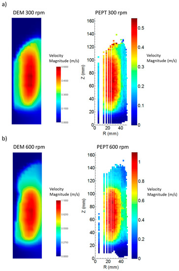 Comparison of the velocity flow field for DEM simulations and PEPT data at the impeller speed of (a) 300 rpm and (b) 600 rpm.
