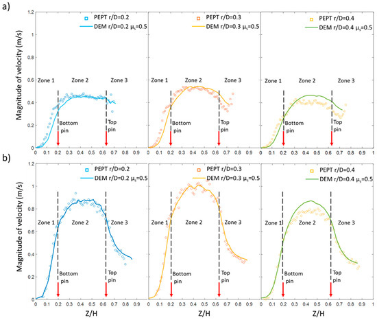Velocity magnitude along the dimensionless attritor height (Z/H) for three dimensionless radial positions (r/D: 0.2, 0.3, 0.4). Comparison between DEM results and PEPT data at the impeller speed of (a) 300 rpm and (b) at 600 rpm.