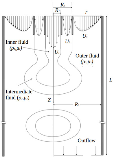 We consider an axisymmetric compound jet, comprising three viscous immiscible liquids, in a cylindrical tube of length L and diameter , as shown in Figure 1. The inner fluid (“ 1”) and intermediate fluid (“ 2”) are respectively injected from the inner nozzle and the annular region between the inner and outer nozzle into another outer coflowing fluid (“ 3”) within the cylindrical tube. We denote the inner radius of the inner nozzle by , and the inner radius of the outer nozzle by . We assume the wall of the cylinder to be rigid, with inlet at and outlet at . The fluids are assumed to be Newtonian and incompressible, with densities and dynamic viscosities of , , , and , respectively. The average velocity of inner, intermediate and outer fluids are denoted by , and respectively. = 0 represents the state where the outer fluid is at rest and reflects outer fluid coflowing. Both these configurations drastically affect the formation of compound jets and drop [14,16]. At the inlet, we apply fully developed laminar profiles, as specified in Equation (4). Also, the interfacial tension of the two fluid interfaces is assumed to be constant.