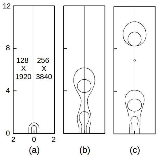 A grid refinement test was conducted with 64 × 960, 128 × 1920 and 256 × 3840 resolutions. Figure 2 shows the results of the interfacial evolution using the 128 × 1920 grid compared with the 256 × 3840 grid. The results were nearly the same with breakup length changing by less than 0.5–1.5% for the 128 × 1920 and 256 × 3840 grid resolutions, whereas 64 × 960 yielded some differences. Similar grid refinement tests were also conducted by Homma et al. [22] and Vu et al. [13] to numerically investigate the formation of a single and compound jet, by using the Front Tracking Method in both resting and coflowing outer fluid. For the results presented below, we incorporate 1920 grid points in the axial direction and 128 grid points in the radial direction. In the previous works, method validations have been conducted carefully. A validation case is shown in Figure 3a,b where comparison with the non-coflowing experiments of Hertz and Hermanrud [3] has been presented. Such validations are satisfactory and confirm the accuracy of the method used in this analysis. We also assume that the drop doesn’t merge with the jets so as to obtain the most suitable results that are observed in experiments [16].
