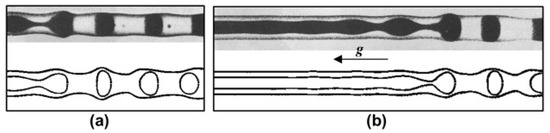 A comparison between experimental jets of Hertz and Hermanrud [3] (top section) and the computed jet (bottom section) profiles at computational time: (a) = 251 and (b) = 253. The parameter used to generate the figures, calculated based on the inner most fluid, are , , , = 1, = 1, = 0.38, = 1, = 0, = 2, for both experimental and computed jets. = = 0.05 is for the computed jet; = 0.001 for the experimental jet. The figure is taken from Vu et al. [11]