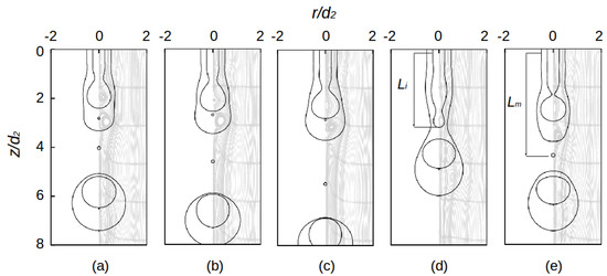 In Figure 4a–e, the inner and intermediate jets are ejected from the coaxial nozzle into the outer co-flowing fluid and proceed to form compound drops. In the initial stages, a vortex forms inside the inner drop as shown in Figure 4a. The right sides of the snapshots in Figure 4 show the streamlines, whence the vortex formation process can be clearly seen. The vortex in the inner drop starts to weaken when the diameter of the growing inner drop reaches 0.75 times its ultimate value. This weakening of the vortex formation in the inner drop (Figure 2b) is basically due to more fluid accumulation in the growing inner drop which later results in pinch-off [13]. This growing drop detaches from the inner jet and then is carried away by the intermediate fluid motion (Figure 4d). Similarly, in the initial stages, vortex formation starts to occur on the inner surface of the intermediate fluid (Figure 4a,b). The vortex in the intermediate drop starts to weaken after the diameter ratio of the growing intermediate drop to the fully developed intermediate drop reaches 0.68 (Figure 4c). The motion of the inner drop further weakens the vortex formation inside the nascent intermediate drop (Figure 4d), which results in necking and detachment of the intermediate drop (Figure 4e).