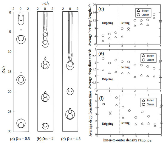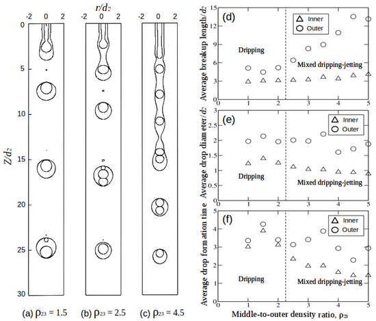 The effect of , on the time when the inner and compound drops form is shown in Figure 7f. 2.5, the difference in the time of inner and compound drops formed is small, which corresponds to single-core drop formation. Whereas, for 2.5, this difference in drop formation time is much greater, which reflects multi-core drop formation. The results obtained from and show that varying the density of the inner and intermediate fluid has a significant effect on the breakup length, drop type formation and drop diameter of inner and compound jets.