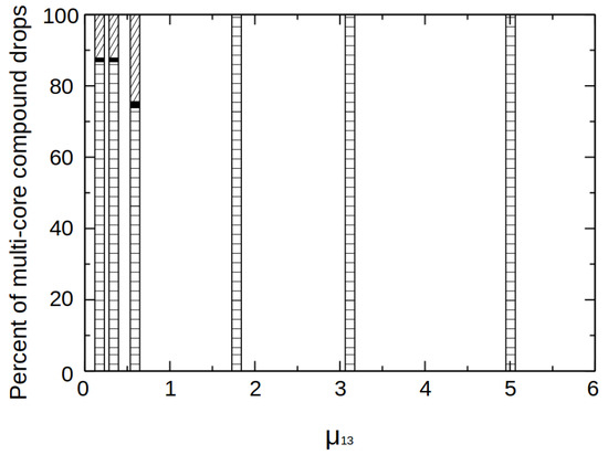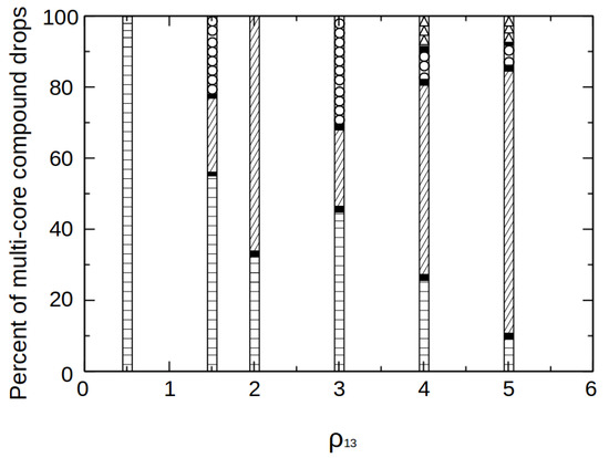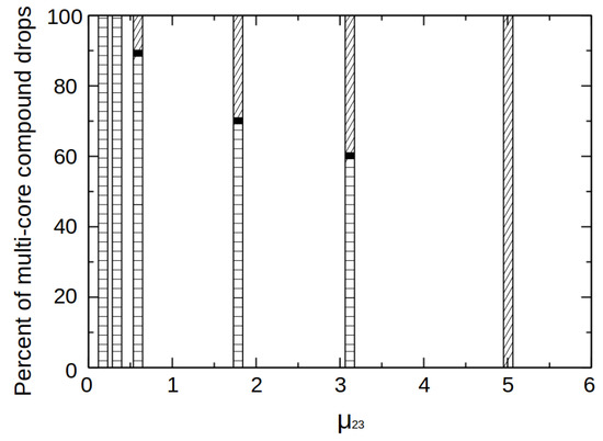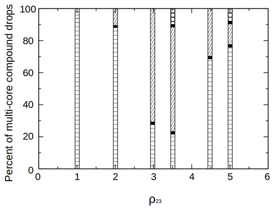 In Figure 5d, it can be seen that for , both the inner and intermediate jet breakup lengths are lower than that of the baseline case (). On the other hand, for , due to the higher density of the inner fluid, the inertia tends to stabilize the inner jet and thereby increase its jet length. Also, as the inner jet is enclosed by the intermediate jet, the inner jet carries the intermediate jet along with it and the jet length of the intermediate jet increases. In general, increasing favors the jetting mode for both inner and intermediate jet. The transition from dripping to jetting, in this case, was found in the range of , as shown in Figure 5d by a thin dotted line that separates the dripping and jetting regions. Note the drop diameter, formation time and jet breakup length calculated in Figures 5, 7, 9 and 11 are over 5–10 drops on average. The number of drops is increased to more than 15 in the case of chaotic drops. Figure 6 shows the percent of multi-core compound drops formed with varying density ratios. For density ratio , the compound drops are single-core. As the density ratio is increased, the compound drops formed are two/three-core, and for higher values, four-core compound drops are formed. The percent of one-core, two-core, three-core and four-core inner drops are different due to which the drop types formed are not periodic. In this paper, the phenomenon of alternating formation of single and multi-core drops is termed “chaotic drop formation”.