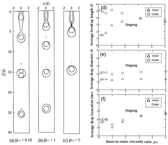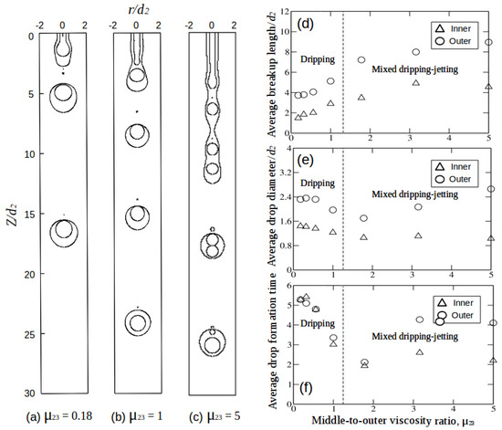 For = 0.18 (Figure 9a), it can be seen that the inner drop forms in the dripping mode and the compound drops form close to the jetting mode. The lower viscosity of inner fluid reduces the resistance to capillary-driven necking instability, facilitating the breakup of the inner fluid jet, and thus results in decreased inner jet length. Such observations are also seen in viscous fingering phenomena, in which less viscous fluid displacing a more viscous immiscible fluid tends to become unstable [28]. Due to the lower viscosity of inner fluid ( = 0.18) which break up more easily than the intermediate fluid, several drops formed at early stages can occupy the core of an intermediate drop, and hence form multi-core compound drops. On the other hand, with = 0.18, the intermediate fluid is approximately 5.5 times more viscous than the inner fluid. Due to the large viscous resistance of the intermediate fluid, which stabilizes the interface and delays necking, the breakup length of the compound drop increases.