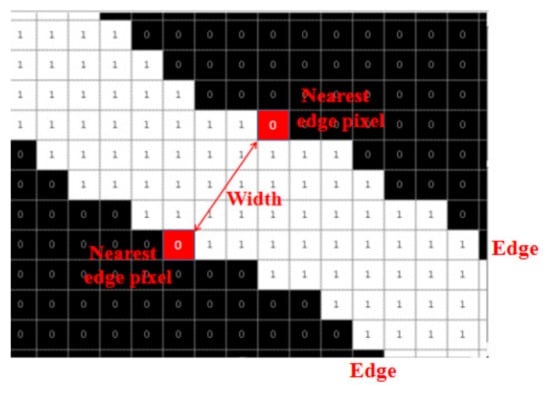 Crack width is obtained as the distance between the edge pixels nearest to the center skeleton pixel, as shown in Figure 1. In order to obtain crack size, the crack edge must be detected. In the broad sense, the sudden change of an object is called the edge. In image processing, the edge is often detected by abrupt changes in the grey value. Edge detection must meet two conditions: it must effectively suppress noise and locate the edge as accurately as possible. Image binarization [31,32] is one of the most commonly used image processing methods. In the binarization process, a specified threshold is set for the pixel value of the greyscale image. When the greyscale pixel value is lower than the corresponding threshold, the binarization result is zero (black). In contrast, the binarization result is one (white) when the pixel value is higher than the threshold [24]. Therefore, image binarization is the primary task of calculating crack width. For the acquired image, after the correction and the obtaining of the grayscale image, binarization can be performed.