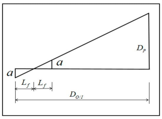 where is the real crack width in metric units (mm), is the obtained crack width in pixels, is the dimension of the scale in pixel, l is the dimension of the scale, is the pixel resolution of the imaging system, a is the pixel size, D is the distance in mm from the object plane to the camera chip, and is the focal length of the camera in mm. The calculation principle diagram of the pixel resolution is shown in Figure 4.