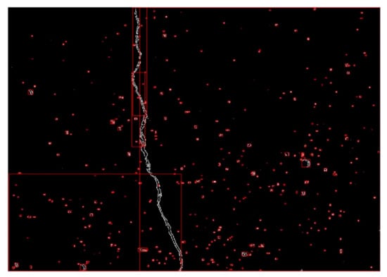 Crack length estimation [36] is challenging due to irregularities in crack development. Traditional manual measurements have large errors, and thus, image processing technology has obvious advantages in length estimation. Crack length is generally calculated by counting the number of pixels. As seen from the previous section, although the Canny edge detection algorithm combined with the Otsu method eliminates most of the noise, there is still a small amount of isolated noise that is difficult to eliminate. Therefore, in order to estimate the crack length, it is necessary to eliminate the noise as much as possible. This can be done by iterating through all the pixels, looking for all connected fields, as shown in Figure 6, and marking them with their circumscribed rectangles. One can then assume that the size of the circumscribed rectangle of the p th connected field is and is the area of the connected field (i.e., the number of pixels). When the pixel is black, , and when the pixel is white, . The area is defined as: