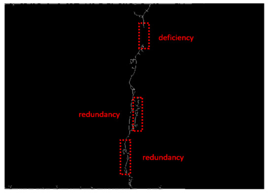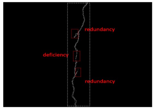 The central skeleton method [38] is currently the most commonly used method. This method refines the crack into a single-pixel skeleton, and estimates the crack length by counting the number of skeleton pixels. However, the pixel missing and redundancy problems caused by this method are often difficult to compensate (see Figure 8). In order to solve the problem of missing and redundant central skeleton pixels, this paper proposes double edge skeleton method. By counting the number of pixels by region, the missing pixels can be complemented while eliminating the effects of redundant pixels, as shown in Figure 9.