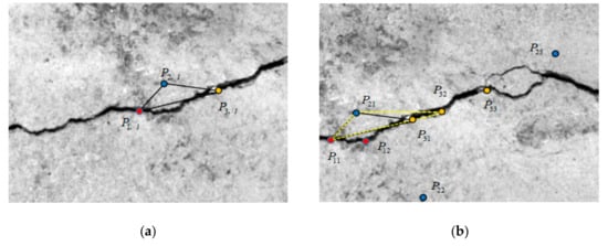 Though these methods have certain advantages in various fields, some problems remain. First, when acquiring images, experimenters need to calibrate the camera’s unit pixel size [26,27] in a very cumbersome way, such as the scale method [28] of positioning rulers at the crack position, which is not applicable to all bridge types. Relatively speaking, the object distance method does not require cumbersome calibration, the operation is simple, and it is suitable for almost all bridge types. However, there is no uniform standard for the calculation of crack size. Second, most current methods for calculating crack length refine the crack into a single pixel skeleton along the direction of the crack and then calculate it by counting the number of pixels. However, these methods heavily rely on the choice of threshold for image binarization. When the threshold value is large, the ends of the cracks and some small cracks are often ignored, which can result in missing pixels, making the calculated value smaller than the actual length. When the threshold value is selected to be small, the crack is wide, and a large amount of noise is present, the problem of pixel redundancy occurs, resulting in a calculated result that is larger than the actual value. Third, most image stitching algorithms [29,30] tend to apply point-to-point matching when feature points are matched. There is no correlation between feature points, which often causes mismatching. Then, the mismatched points should be eliminated, which results in low computational efficiency. To the authors’ knowledge, the associated researchers did not check the stitching accuracy after they finished image stitching.