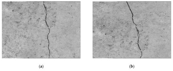 At present, cracks on concrete structures are mainly inspected by the manual visual observation of the surface. For example, in bridge crack detection, a large machine such as a test vehicle is usually used to position the inspector underneath the bridge, and the cracks are identified by the naked eye and measured by an optical microscope. It is precisely because of this measurement characteristic that the detection accuracy of cracks largely depends on the proficiency of the detection personnel. For many structures, the inspector cannot go to the testing location. Therefore, this manual detection method is inefficient, costly, and has security risks. With the rapid development of signal processing theory and modern computer technology, machine vision [3,4,5,6,7,8] has played an increasingly important role in crack detection. Image processing technology can be used to safely and efficiently extract crack information. Crack information extraction mainly includes the identification of the crack size [9,10,11,12] and the final stitching [13,14,15,16,17] of the crack image.