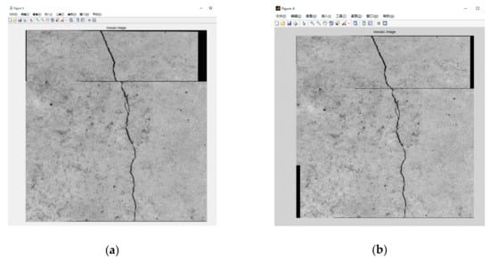 In the process of acquiring images, a crack may be scattered in multiple images due to various conditions, which increases the difficulty of obtaining crack information. Therefore, it is necessary to splice multiple crack images into a complete crack image to obtain more comprehensive information about the crack. In the process of image stitching, it is necessary to adjust the size and angle of the original second image and then stitch it with the original first image. The precondition for stitching two adjacent images is that they must share an overlapping area. The larger the proportion of the overlapping area is, the higher the stitching precision. The main task of splicing is to determine the overlap degree of adjacent images in the directions of the height and width and then remove the overlapping area to obtain a complete panoramic image [39]. The splicing process is shown in Figure 10.