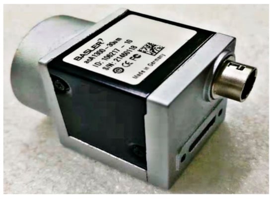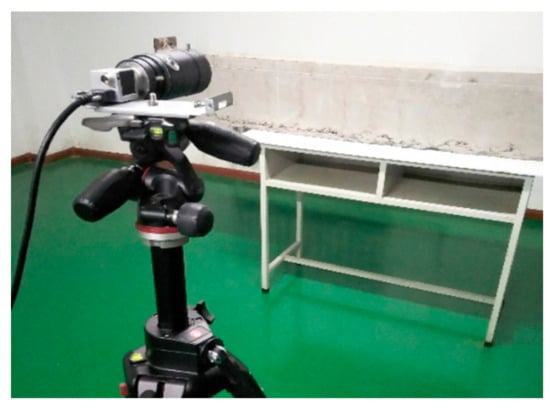 Laboratory testing was conducted in this study to effectively obtain the size information of the crack. The experimental model is two concrete test beams with dimensions of 150 × 300 × 2200 mm in the Wind Tunnel Laboratory in the Northeast Forestry University. By controlling the loading force, the two beams can be loaded to contain cracks almost entirely in the width. The test used an acA1300-30 µm Basler industrial black and white charge-coupled device (CCD) camera (see Figure 16). The camera does not require an external power supply and uses only a data cable connected to the computer’s USB3.0 interface, which enables convenient operation. The camera sensor chip size is 4.9 × 3.6 mm with 1.3 million pixels, the horizontal/vertical resolution is 1296 × 966 px, and the horizontal/vertical pixel size is 3.75 × 3.75 μm. To enact the procedure, one must adjust the tripod to level the camera and rotate the camera to hold the camera’s optical axis perpendicular to the plane of the test beam to capture an image. Then, one must use an HCIYET HT-310 Hongcheng laser range finder to measure the distance between the camera and the subject. The crack image acquisition system is shown in Figure 17.