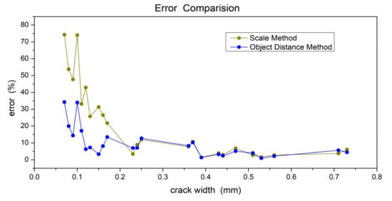 According to the data in Table 1, the error comparison curves of the object distance method and the scale method were obtained (for several cracks with the same width but different errors, the error was averaged), as shown in Figure 18. The identification accuracy of the two methods increased with increasing crack width. When the crack width was less than 0.2 mm, the accuracy of the object distance method was obviously higher than that of the scale method. A detailed comparison of the errors is shown in Table 2. The comparison results showed that when the crack width was greater than 0.20 mm, the average error of both methods was within 8.2%. When the width was less than 0.20 mm, the error of the scale method was larger and the average value was more than 30%. When the crack width was between 0.10 and 0.20 mm, the average accuracy of the object distance method could reach 90%; when the crack width was 0.10 mm or less, the accuracy of the object distance method could not meet the measurement requirements. In summary, the object distance method had a high accuracy and could accurately identify cracks with a width above 0.10 mm.