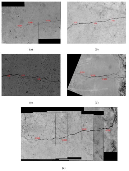 This experiment aimed to achieve the research goal by stitching several groups of crack images. Due to the length limit of this article, only five cracks with different brightness, shape and width are selected for illustration (see Figure 19). The stitching results are shown in Figure 20, where the number represents the crack width at that particular pixel.