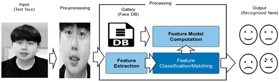 The AdaBoost algorithm is a technology often used for face detection, and is a method for creating strong criteria for selection by combining weak criteria, which has advantages [19,20]. This reduces the probability of drawing wrong conclusions, and increases the probability of accurately assessing problems that are difficult to judge. For facial recognition, a face area image is required. In order to increase the success rate with face detection and facial recognition, the impacts of lighting and inclination should be minimized, and images should be normalized. So, as images are normalized, the probability of errors decreases [21]. Video-based emotion recognition analyzes the characteristics of the face in a video. At first, this study used classic machine learning and computer vision. For example, the characteristics of the face were extracted based on the gradients of the face extracted from video. The characteristics were analyzed, using algorithms like a support vector machine (SVM) or random forest, to figure out the facial expression. And yet, there is a singularity effect according to the surrounding background or the illumination intensity of the video. In addition, accuracy is greatly affected by the angle of the face. Figure 2 shows a facial recognition algorithm using a face database. The dataset used in the early stages was secured in a limited environment; however, videos that contain everyday situations are in the dataset [22].