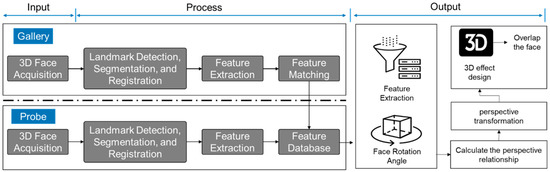 Figure 3 shows how to recognize a face in a three-dimensional (3D) image [23,24]. The flow of the method can be separated from the training phase and the test phase. In the training phase, face data are collected from 3D images, and pretreatment is performed to obtain a clean 3D face without bending. Preprocessed data include facial features from a feature extraction system [25]. The features, such as extracted face data, are stored in a feature database [26,27]. Next, in the test phase, the entered target faces are the same as those used in the training phase and during the 3D face data collection, pretreatment, and feature-extraction steps. In the feature-matching phase, match scores are calculated by comparing the target face with the database saved in the training phase. When the match score is judged to be high enough, this algorithm determines that the target face has been recognized. Also, facial recognition technology is used in the augmented reality field. It is a method to extract feature points, and draws the coordinate plane of the face to calculate the position, to make a 3D effect of the product, and overlap it onto the face [28,29].