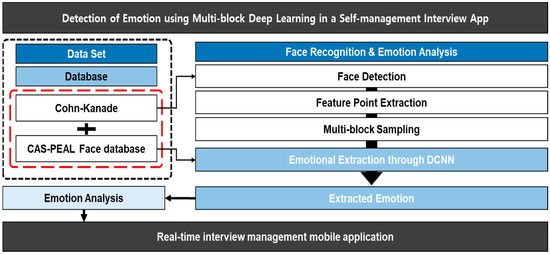 Figure 4 shows the whole process of the system described in this paper. First, we proceed with facial recognition, where features are extracted. Multi-block sampling is performed by extracting feature points from the recognized faces. Sampled data are extracted through deep learning based on a DCNN. Analysis is conducted based on the extracted emotions, and the analyzed data are managed by the interview system proposed in this paper. Interview management is done through the application itself. The CAS-PEAL face database is used for facial recognition, and the Cohn-Kanade database is used for emotion extraction.