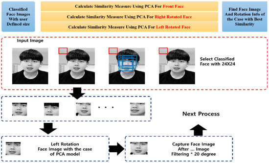 Face detection was made by moving a 24 × 24 pixel block; for simple patterns in multiple AdaBoost learning, basic patterns were used. In addition, the number of simple detectors to be searched by the learning process was selected as 160, and the learned detectors became serialized, in turn enhancing the processing speed. The learned detectors were serialized into 10 stages in which 16 learned detectors belong in an arbitrary manner. Parameters for each stage were adjusted, and as for images in multiple AdaBoost learning, 24 × 24 resolution was used. For detection by size, the input images were classified (based on the degree of down-sampling) into three types, and the face was detected from among the down-sampled images. In detection by rotation, facial images rotated at −5° to +5°, +15° to +25°, and −15° to −25° were learned by AdaBoost. Then, by using the serialized detector, they were each analyzed and, in order of detection, rotation of the face was classified. The detected faces were classified into nine types, and the information about the locations of the detected faces was provided as well. Figure 7 shows the face image–detection process. For face detection, 80 × 60 down-sampled images were used for detecting a large face, 108 × 81 down-sampled images were used for a medium-sized face, and 144 × 108 down-sampled images for a small face. The sequence of detection by size was selected to enhance the detection speed and was done as follows: Detection of 80 × 60 down-sampled images was first, followed by the 108 × 81 down-sampled images, and then, the 144 × 108 images. If a detected face overlapped the block detected in the face from the down-sampled image in the preceding step, that detection was not valid. The input image was searched for among the down-sampled images, and when it was detected, a block of the face from the detected image was cut and then normalized to the predesigned size and passed to the next process. At the time, principal component analysis (PCA) was used to measure similarity with the input image, verifying the face. This is a process of rotating an image by using the verified information on rotation of the face, until the rotation of the face in the image becomes almost zero. When the rotation of the face was verified to be between +15° and +25°, the face was rotated by −20°, and when the rotation of the face was between −15° and −25°, the face was rotated by +20°.