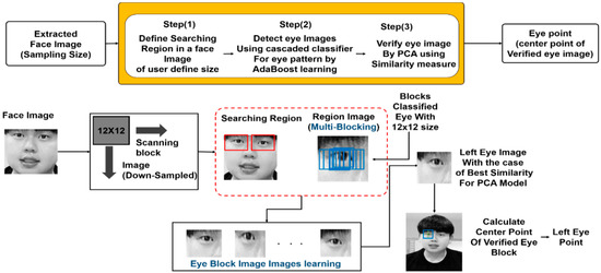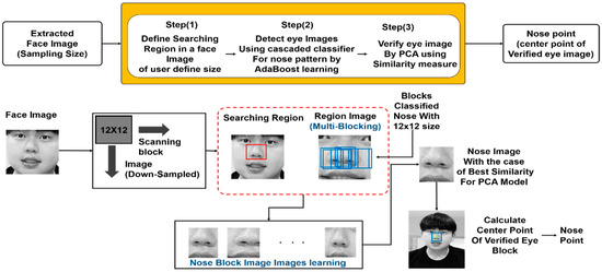 When the user’s face was extracted in the aforementioned process, the positions of the eyes and nose should be extracted. The patterns for the person’s eyes could be extracted by using the facial image obtained through the face detection process. Eyes and nose extraction can be classified into three stages. The first stage was to designate a region to search for the eyes in the facial image obtained by the face detector. From this stage, it was possible to roughly estimate the position of the eyes, even if they were not precise, and such an estimated position could be defined as a certain domain. In the second stage, the region for the eyes must be clearly defined, as shown in Figure 8 After defining the eyes region, we used multiple AdaBoost to determine 12 × 12 pixel eye images and 12 × 12 pixel non-eye images to prepare the serialized eye detector. This was to classify these eyes from other eyes. Then, AdaBoost went through a process of detecting block images that had the eyes in the designated region. The last stage was to use PCA, trained with eye images, to measure the similarity of each eye image and to select the image with the highest similarity. As shown in Figure 8, the position of the eyes could be defined as the center point of a verified eyes image.