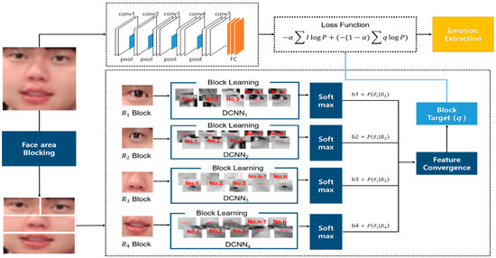 In the formula, q is the softmax probability value formed by learning the features of multi-blocked images, while is the probability the DCNN learned by utilizing the features of the whole images, is the index of the feature category, and is the total number of classes. This study used both the knowledge block target containing the feature information of the multi-block images delivered by the DCNN while learning, and the existing true class target value so as to allow learning everything. It extracted accurate emotions, utilizing feature extraction of the whole image area and the features of the blocked images of the key areas, giving a different weighted value to each of the two loss functions, L1 and L2, as seen in Equation (4):