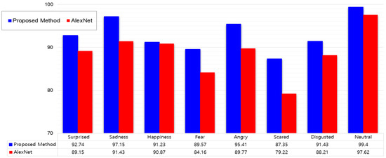 In addition, for face area detection and estimation analysis, the CAS-PEAL face database was employed. The learning data in the database used consisted of classes of facial expression information for a total of 1040 persons, and consisted of a total of 1240 sheets of images for each class. The data for deep learning was composed of 10 sheets per emotion class, with noise added to the learning data. On the other hand, the AlexNet [35] structure, which is used a lot for facial recognition, was selected for comparison with the deep learning method proposed in this paper. Figure 11 shows a comparison of emotion recognition accuracy with the proposed method against the accuracy with AlexNet. The facial expressions were recognized through extraction of the entire face area and the main areas, and the accuracy of extracting emotions according to the expressions was compared, with the proposed method showing accuracy about 3.75% higher.