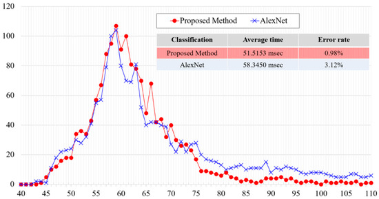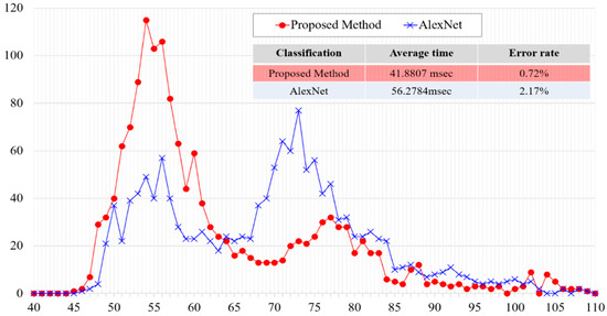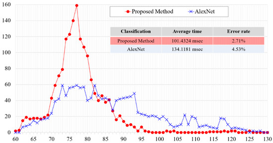 Figure 13 shows the distribution of the processing time to detect the eye area, and the results of eye area detection. In eye area detection, the distribution of the processing time was not affected by normalization; however, there was a difference in the error rate. As a result of the experiment, the proposed method was deemed excellent.