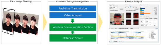 Recently, various services based on facial recognition have been provided. The face recognition process is as follows. A camera captures a face image. Then, the eyes, eyebrows, nose, and mouth, which are the main factors for emotion extraction, are analyzed to extract characteristics data, and they are compared with feature data in a database provided for face analysis in facial recognition. The facial recognition technology analyzes facial expressions to determine emotional states, such as happiness, surprise, sadness, disgust, fear, confusion, etc., and is used for advertising-effect measurement, marketing, and education [16]. Founded by the Massachusetts Institute of Technology Media Lab, Affectiva released Affdex, a solution for recognizing facial expressions and identifying emotional states [17]. Figure 1 shows the Affectiva facial recognition platform. Affectiva modularizes emotion recognition-related artificial intelligence (AI) technology, distributes it through its website in the form of a software development kit (SDK), and opens it for use by various engineers and in business fields. It applies an emotion recognition solution to Tega, a robot that teaches foreign languages, and presents functions that provide appropriate content and gives rewards by understanding children’s facial expressions. In addition, the facial recognition technology has been widely applied to various fields, such as locating crime suspects and lost children, and enabling mobile payments, in particular. It is used to arrest criminal suspects and locate lost children through artificial intelligence cameras attached on the chest, based on an agreement with US police [18].