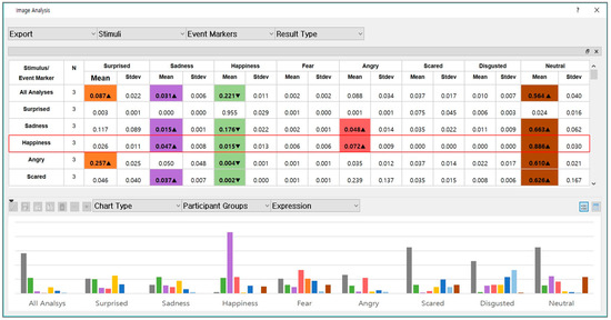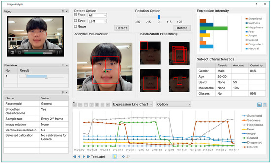 Figure 16 shows a system that analyzes images by capturing one frame after dividing a video into frame units. System functions include video playback, analysis visualization, recognition options, rotation options, binary processing, curve graph representation of emotions, object feature analysis, etc. After capturing the video, the user selects the part to be recognized with the recognition option and then recognizes that part through a binarization process. The binarization function finds the feature points of the image. There may be a rotated face in the captured image, so there is also an option that rotates the face to the correct position. This function offers a selection range of −25 to +25 degrees. There are eight emotions for analyzing a person’s feelings through the recognition function: Neutral (usual expression), contempt, disgust, anger, happiness, surprise, sadness, and fear. There is also a function that graphs the emotions in each image captured from the video. Analysis of the image in Figure 16 confirms the person is happy. Object characterization analysis shows the gender and age, and features like a mustache, beard, and eyeglasses. According to the analysis, the image in the current frame is male, 20–30 years old, without a mustache or beard, and no glasses. A screen shot from the facial recognition and emotion analysis results of the interview management system is shown in Figure 17.