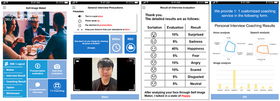 The self-management interview system was developed as a mobile application for smooth interview coaching. When the interview app is used, a real-time video is taken and transmitted to the server. At this time, the person’s emotional state is presented through voice and facial recognition in the video, and real-time coaching is provided accordingly. In addition, including various types of interview coaching content and self-diagnosis programs, it is an effective system for speech practice as well as interviews. Figure 15 shows the image-analysis algorithm-based emotion matching. As for the image-analysis algorithm, the faces and eyes were detected, using an Extensible Markup Language (XML) classifier, and based on the detected images, emotions were extracted from a comparative analysis by the CAS-PEAL face database and Sort image. The figure included in this image is the author, who agreed to provide the figure.