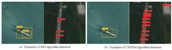 2, the semantic information of a ship from the feature map of CISPNet’s Conv4_3 and FC7 layers is clearer than that extracted by the Conv4_3 and FC7 layers of SSD, in particular, the features extracted by CISPNet can highlight the smaller ship targets. At the same time, the above comparison also shows that the CISP module could reduce the loss of semantic information in the process of feature extraction, and make the feature map understand more contextual information from different scales.