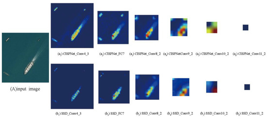 In order to more clearly show the influence of the proposed CISP module on the image feature extraction, we select a remote sensing image containing a large ship target and three small ship targets in a wide sea area, as the input image and extract the features through SSD and the proposed CISPNet.