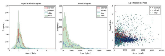Figure 6, which means that the architecture of our model should pay more attention to small detection targets and the set size of the default box can be further reduced. It is noteworthy that the aspect ratio is not symmetrically distributed around 1 and its distribution is also relatively concentrated as shown in