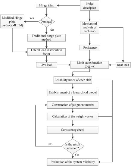 AHP is a decision-making method that combines qualitative and quantitative solutions to solve complex problems of multiple objectives. Considering the subjectivity of the traditional AHP method in constructing the judgment matrix, an objective judgment matrix construction method suitable for evaluating the bridge system reliability is proposed to modify the traditional AHP in this research. The modified hinge plate method (MHPM) was adopted to consider hinge joint damage in the system reliability evaluation. The specific system reliability evaluation process based on modified AHP is shown in Figure 1.