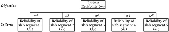 The analytic hierarchy process (AHP), developed by Satty, is a multi-criteria decision-making approach with the characteristics of systematic analysis and easy applicability, and has been widely used in many aspects, such as environmental protection, economic management and strategy decisions [33]. Due to these characteristics, AHP has been applied in the field of bridge engineering, such as bridge risk evaluation and condition assessment, in recent years. Sasmal et al. [34] proposed a systematic methodology for priority ranking towards condition assessment of RC bridges based on AHP and applied the methodology to help bridge managers determine the maintenance order of the bridges. In order to determine the risk level, Peng et al. [35] used AHP to obtain the weight of risk criteria and risk resources in bridge risk evaluation. Wang et al. [33] investigated the influence of 24 parameter cases on the seismic responses of a triple-tower suspension bridge and applied AHP to find the optimal case of evaluation of seismic performance. Lu et al. [36] presented a reliable method for risk assessment of cable system construction of suspension bridges and calculated the weights of the risk evaluation index system based on AHP. Cho et al. [37] applied AHP to determine the importance of random variables in probabilistic risk assessment for the construction phases of a prestressed concrete box girder. However, AHP is still rarely used to assess bridge system reliability.