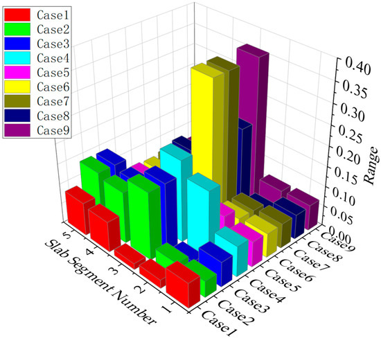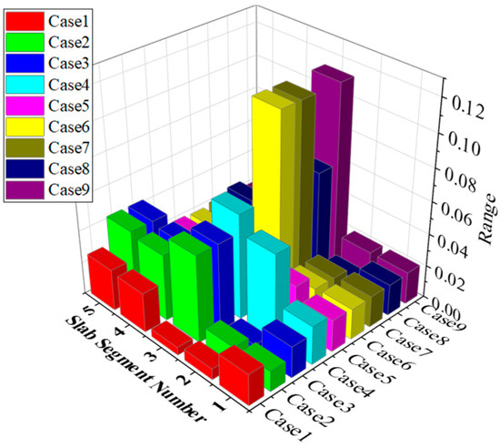 Using the modified hinge plate method (MHPM) proposed by our previous research [28], the influence lines of load lateral distribution under different damage cases of hinge joints are analyzed. According to the most unfavorable loading position of live load, the LLDF of different cases are calculated as shown in Table 4. In order to visually analyze the influence of different damage cases on the LLDF of each slab segment, the range analysis of the LLDF is conducted and the results are shown in Figure 4.