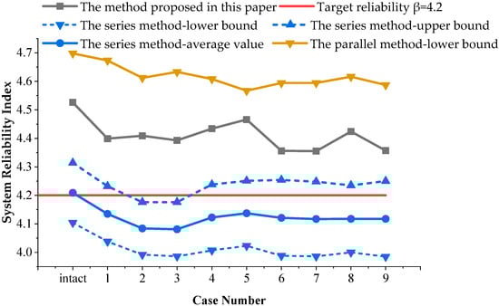Then, the calculation results of the proposed method in this paper and the traditional methods are compared with the target reliability index, as shown in Figure 6. At present, the system reliability does not have a specified target reliability index. Therefore, the target reliability index of the component is adopted as the evaluation criteria. In accordance with the standard [39], the target reliability index is chosen for the RC2 reliability class, .