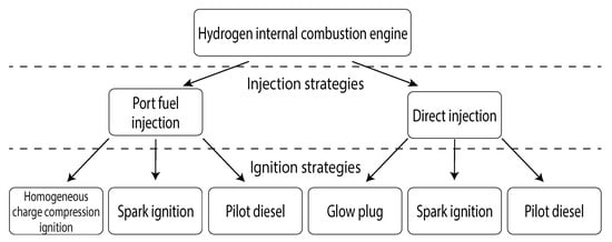 Categorization of hydrogen internal combustion engine (ICE) based on typical injection and ignition strategies.