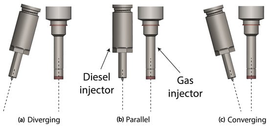 Two co-axial injector Dual-fuel DI configurations, with (a) diverging, (b) parallel and (c) converging nozzle orientation. The figure is not drawn to scale.