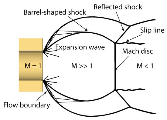Schematic diagram of the highly underexpanded gaseous jet, with shock formation downstream of the injector nozzle. Reproduced from Ouellette [100].
