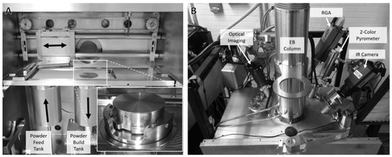 Photos of (A) the EBM/PBF small build volume chamber internal to the system, and (B) an external system view with the electron beam column and available monitoring sensors on top of the build chamber.