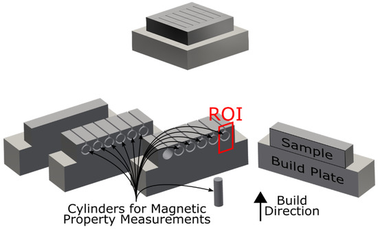 Sectioning and sampling schematic for EBM/PBF Run #5 sample. The two middle sections are 10 mm wide and intended for magnetic sample extraction. Region of interest (ROI) for Figure 16 identified in red. Build direction identified as up, all other directions referred to as transverse.
