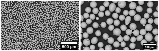 SEM micrographs of alnico (Co-lean) powder prepared by CPP, 45–106 μm cut used for EBM/PBF samples.