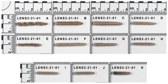 Full-Co DED samples A-K laid down horizontally for comparison. The right side of each sample was the point of connection to the build plate and the left side is the free end (top of the rod, i.e., build direction left).
