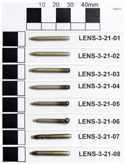 According to the previously listed full-Co and Co-lean DED sample parameters optical images of the samples in the as-built condition are included in Figure 5 and Figure 6, showing variation in sample quality based on the processing parameters. Qualitatively, the best full-Co samples appeared to be B, C and F for sample consistency and length, corresponding to the highest power level of 160 W. The best Co-lean samples qualitatively appeared to be 1 through 4.