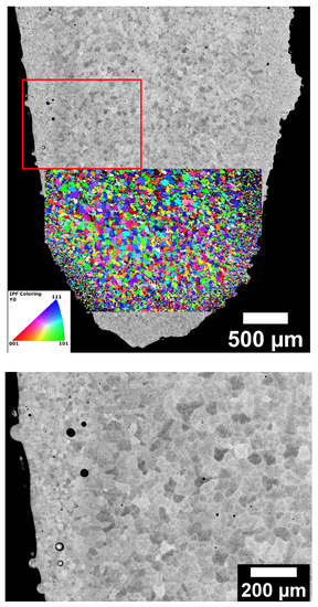 Compositions were collected via inductively coupled plasma-mass spectrometry (ICP-MS) from an external vendor. The chemistry of the solid EBM/PBF run #5 sample was measured with wavelength dispersive X-ray florescence (XRF) (Thermo Scientific ARL PERFORM’X XRF 4200) and energy dispersive X-ray spectroscopy (EDS). Microstructural analysis was performed via SEM (Thermo Scientific Teneo LoVac) and EDS and EBSD were performed with the attached systems (Oxford Max 80 and Nordlys Nano, respectively). EBSD information was correlated with the microstructural information and figures were compiled wherein orientation of individual pixels is color coded and overlaid on top of the micrographs. Further, pole figures (PF) and inverse pole figures (IPF) were created to quantify the degree of texturing, or lack thereof, within each region of interest.