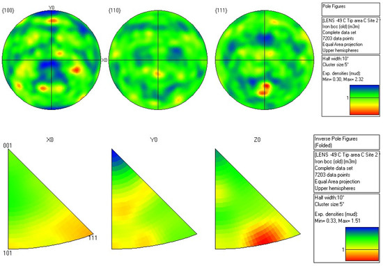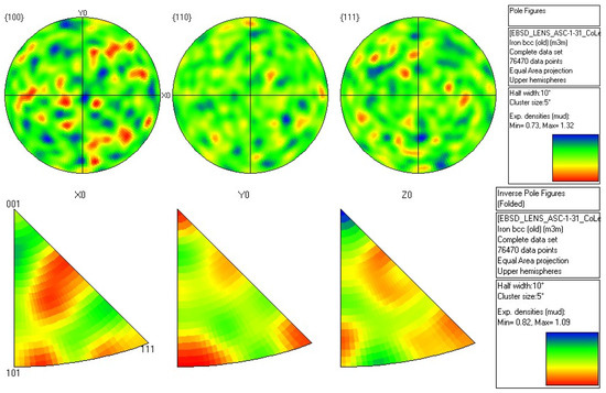 Orientation information from the region of DED sample C shown in Figure 7 with PFs for the {100}, {110}, and {111}-type planes (top) and IPFs for the sample X, Y, and Z directions (bottom). Of note is the lack of apparent texturing.