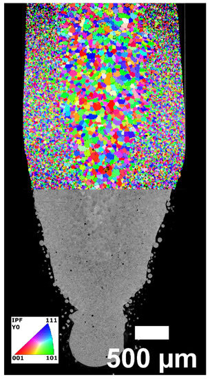 SEM micrograph of the ROI as identified in Figure 2 with IPF coloring overlay. Build direction is oriented towards the top of the image. The dark regions forming a “fish-hook” shape is where the EDM wire had removed material before the wire broke.